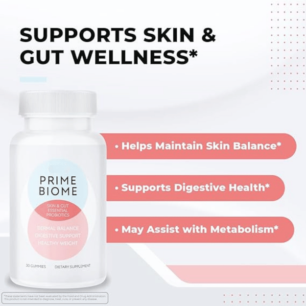 Prime Biome – Skin & Gut Essential Probiotics is a premium gummy supplement formulated to support digestive wellness, dermal balance, and healthy weight management. Each gummy delivers a potent blend of Bacillus coagulans (500 million CFU) and a thoughtfully selected mix of botanicals, including chicory root inulin, babchi powder, lion’s mane, and more known for their ability to nourish your gut and promote vibrant skin from within.