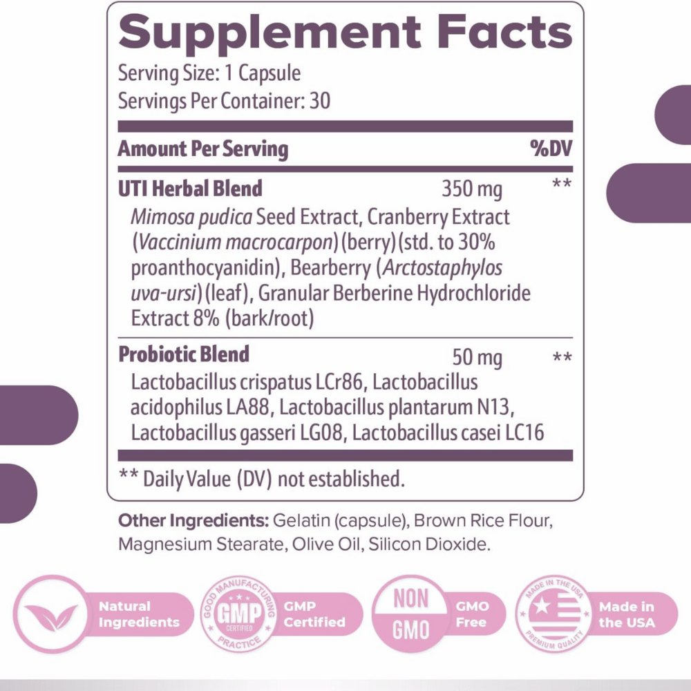 The formula features a powerful UTI Herbal Blend of Mimosa Pudica Seed Extract, Cranberry Extract (standardized to 30% proanthocyanidins), Bearberry (Arctostaphylos uva-ursi), and Berberine HCL, proven to defend against harmful bacteria, reduce inflammation, and maintain urinary tract cleanliness and function.