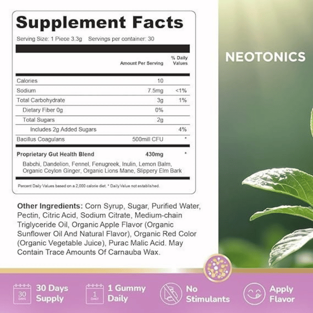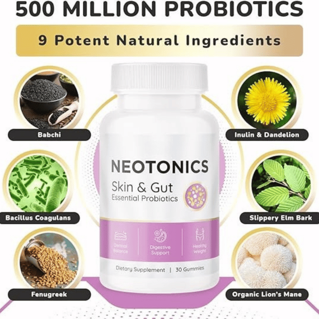 Neotonics is a scientifically-formulated probiotic gummy supplement designed to support both gut health and skin radiance from within. Packed with 500 million CFU of Bacillus Coagulans and a potent Gut Health Blend featuring Lion’s Mane, Babchi, Dandelion, Ginger, Fennel, and more, this once-daily gummy promotes a balanced microbiome, smoother digestion, and a youthful complexion.